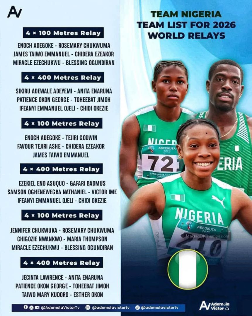 Team Nigeria, comprising 26 athletes, will feature in all relay categories, including the 4x100m and 4x400m races for men, women, and mixed teams. Strong performances in Botswana are expected to secure favourable lane placements and qualification spots ahead of the global championships in China.
