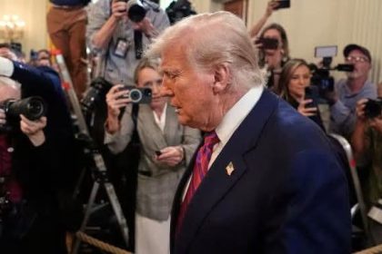 President Donald Trump arrives to speak at an event in the East Room of the White House on July 18,…
